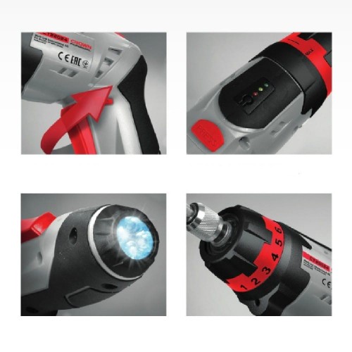 مفك إلكتروني Crown بيربط و يفك وتقدر تستخدمه من غير كهرباء لأنه ببطارية قابلة لإعادة الشحن. المفك فيه كشاف خلفي LED وكشاف أمامي بيفتح وانت مشغل المفك، بالإضافة إلى تصميمه القابل للدوران لتستخدمه على شكل مسدس أو بشكل مستقيم حسب الحاجة.